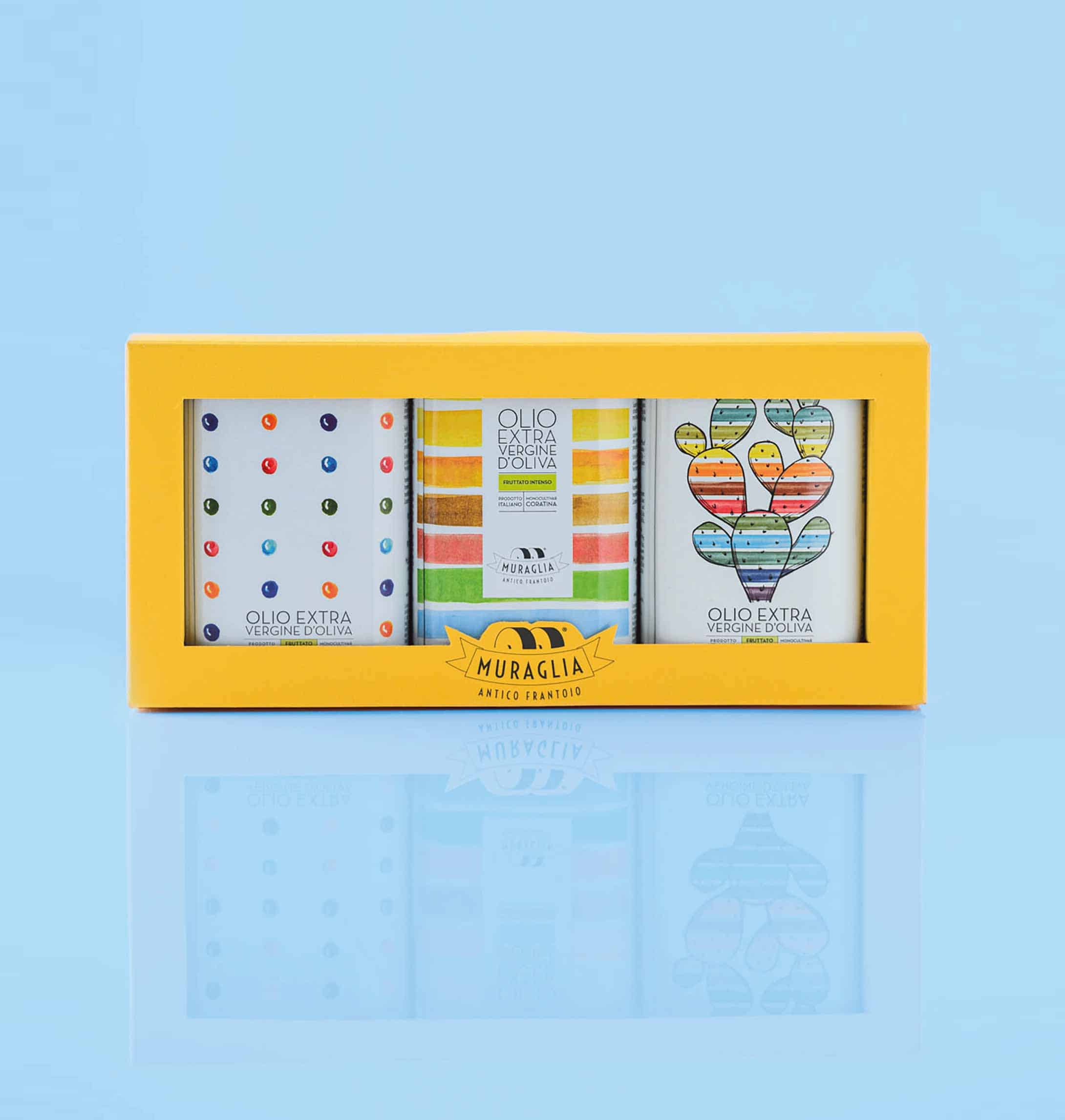 The Colored Cans Set encapsulates all the Apulian nature in vintage-style cans: the Polka Dot design for a retro elegance, the Prickly Pear for Mediterranean shades, and the Rainbow with its enchanting variety of colors. Inside, oil made from Italian olives of the Coratina and Peranzana varieties, perfect for any dish. The artistic packaging makes the can not only a practical container but also a design object for your kitchen or a tasteful gift.
