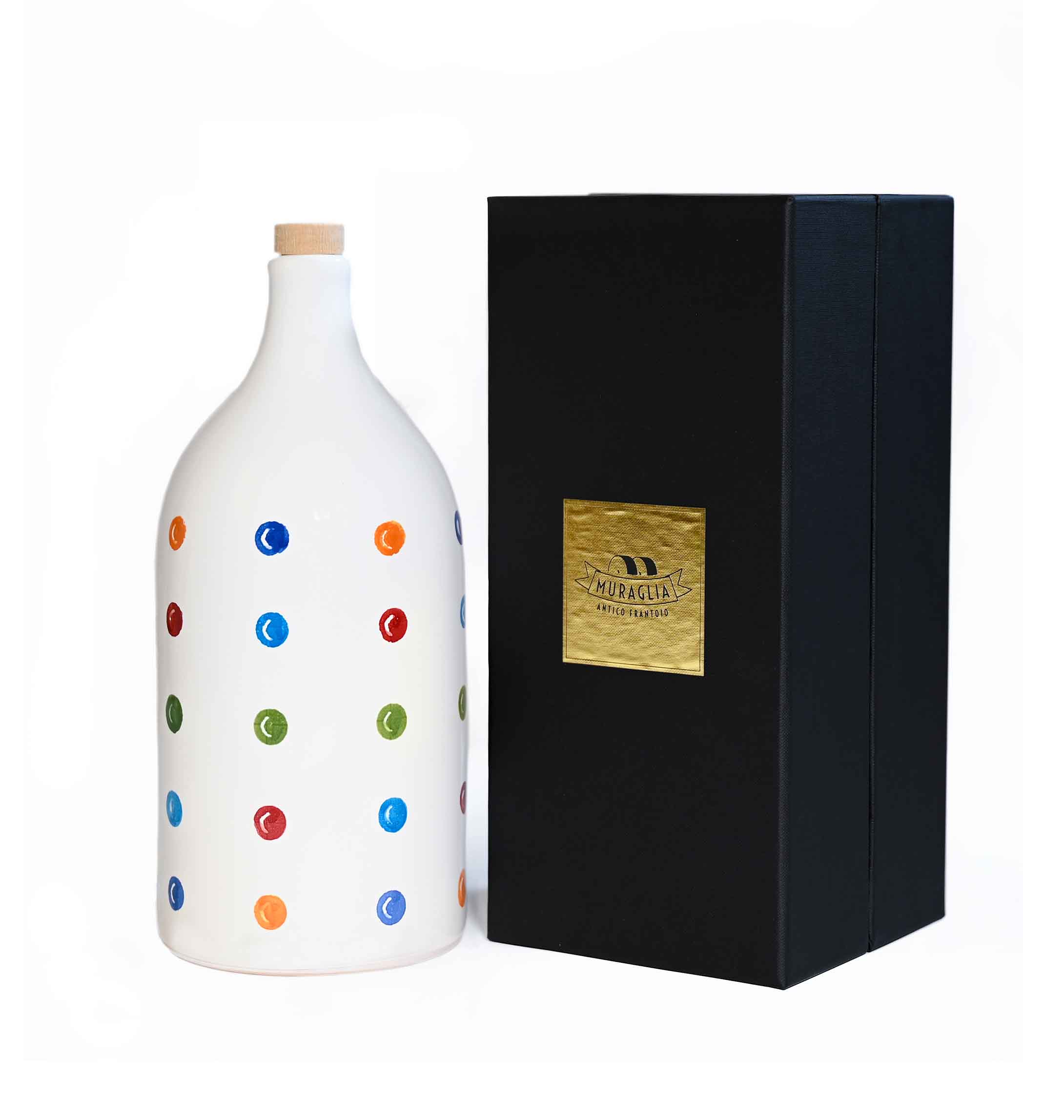 The Magnum ceramic jug, handcrafted by our artisans from Puglia, brings 1500 ml of pourable art to your table, with the scent of freshly pressed olives. Puglian ceramics perfectly preserve the sensory properties of our extra virgin olive oil. Each Magnum Jug is housed in a black box, perfect for an elegant and refined gift. Clean lines and sophisticated colors for a jug with an ironic flavor.